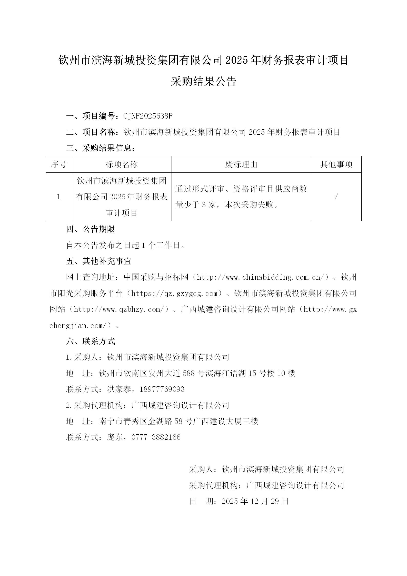 欽州市濱海新城投資集團(tuán)有限公司2025年財務(wù)報表審計項目采購結(jié)果公告