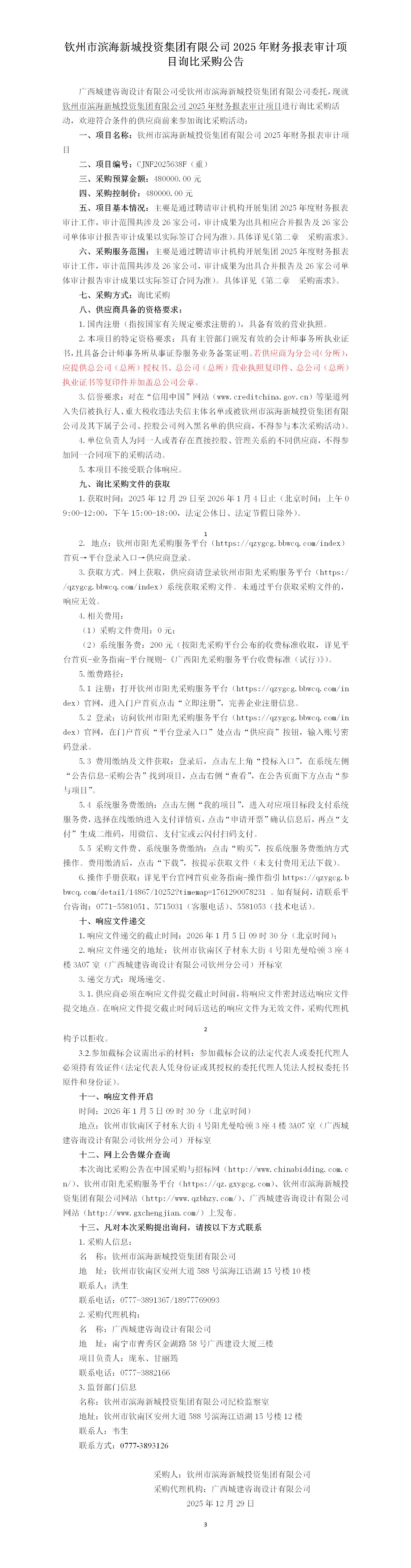 欽州市濱海新城投資集團(tuán)有限公司2025年財務(wù)報表審計項目詢比采購公告
