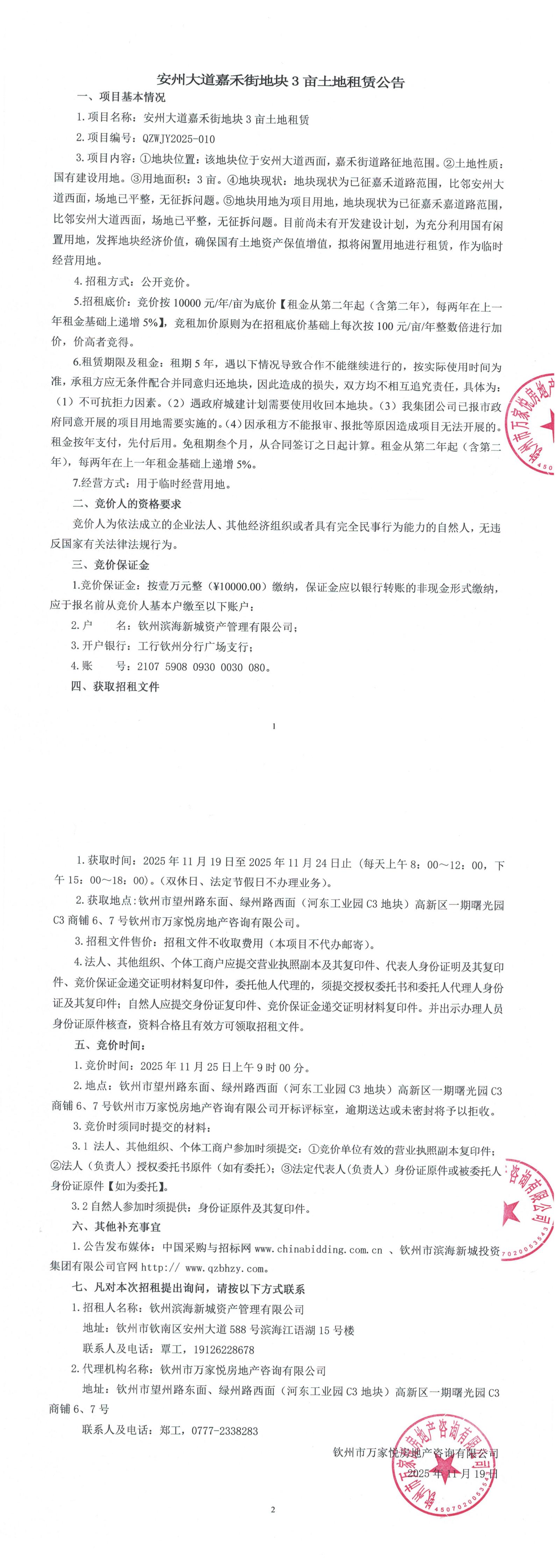 北部灣大學(xué)西門28畝土地作為經(jīng)營場地租賃(QZWJY2025-009)成交結(jié)果公告