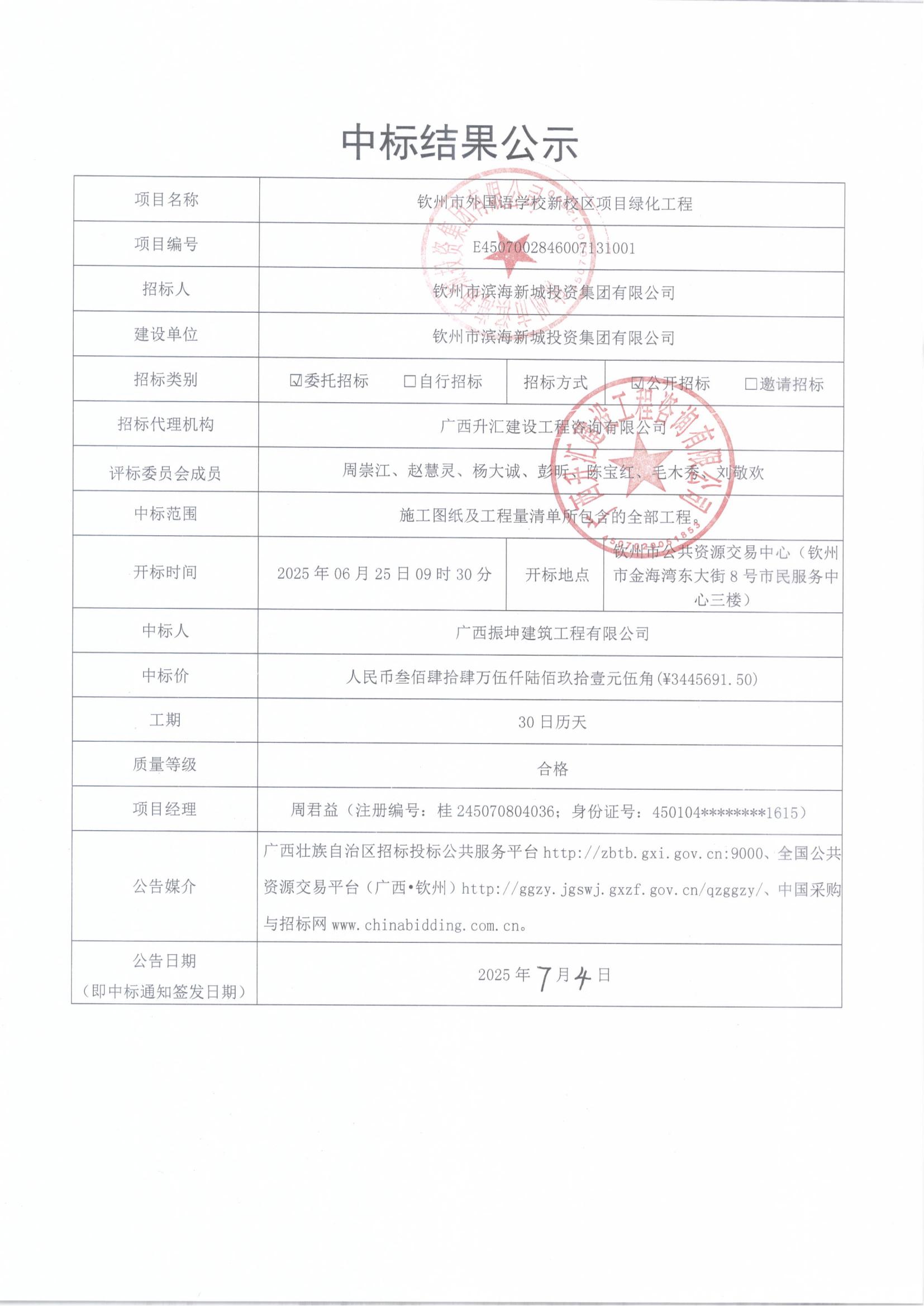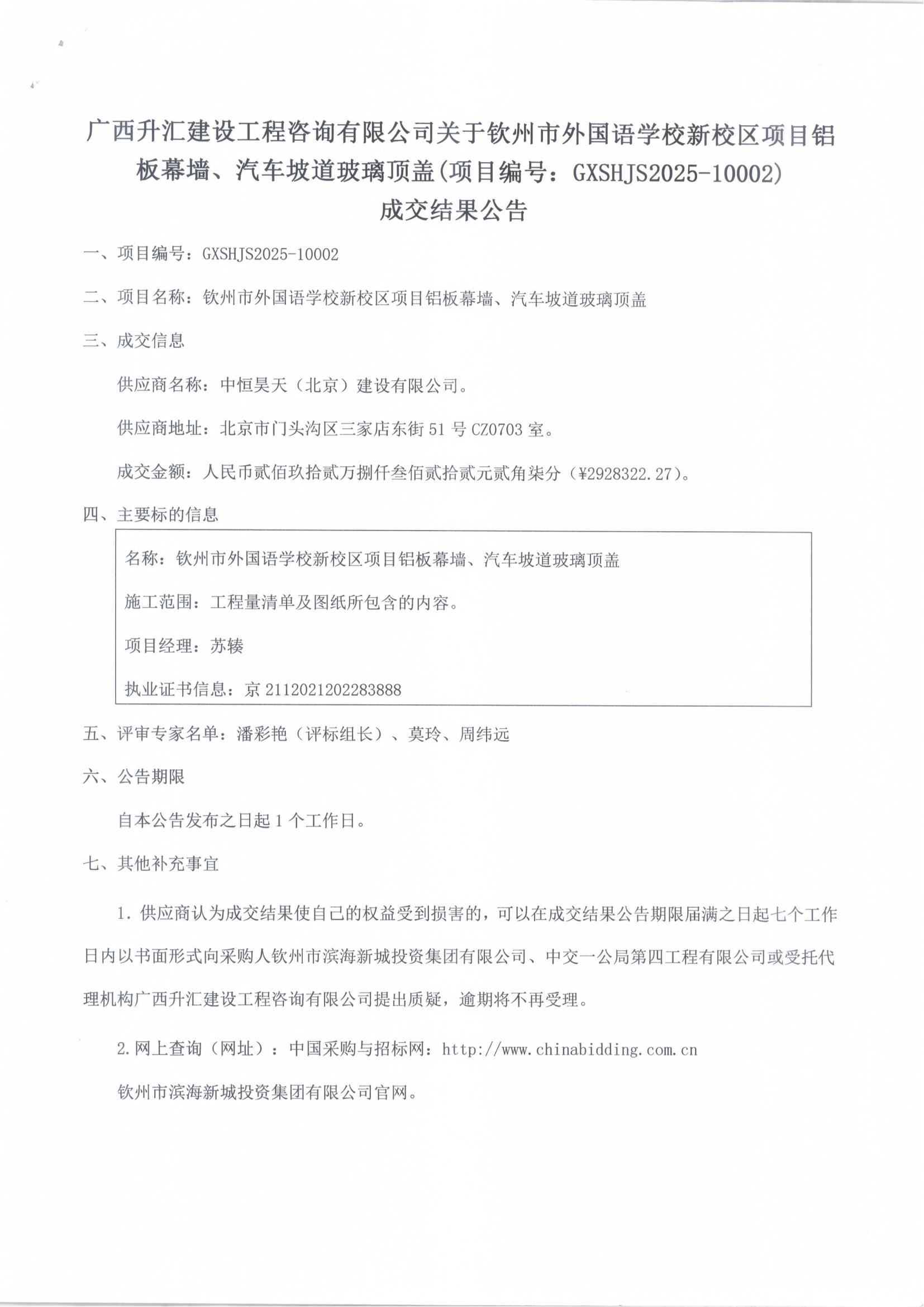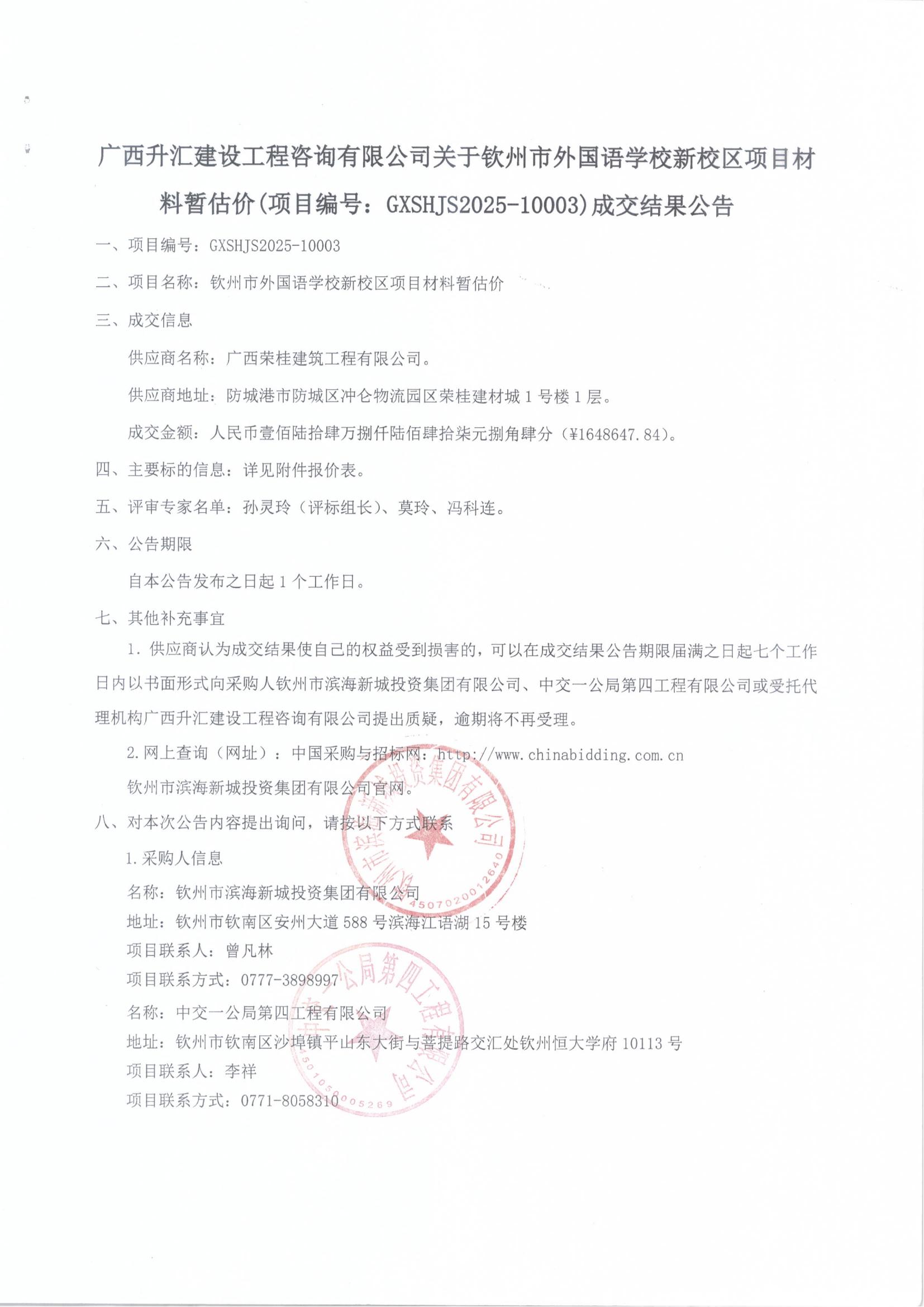 成交結(jié)果公告(欽州市外國語學(xué)校新校區(qū)項目材料暫估價)