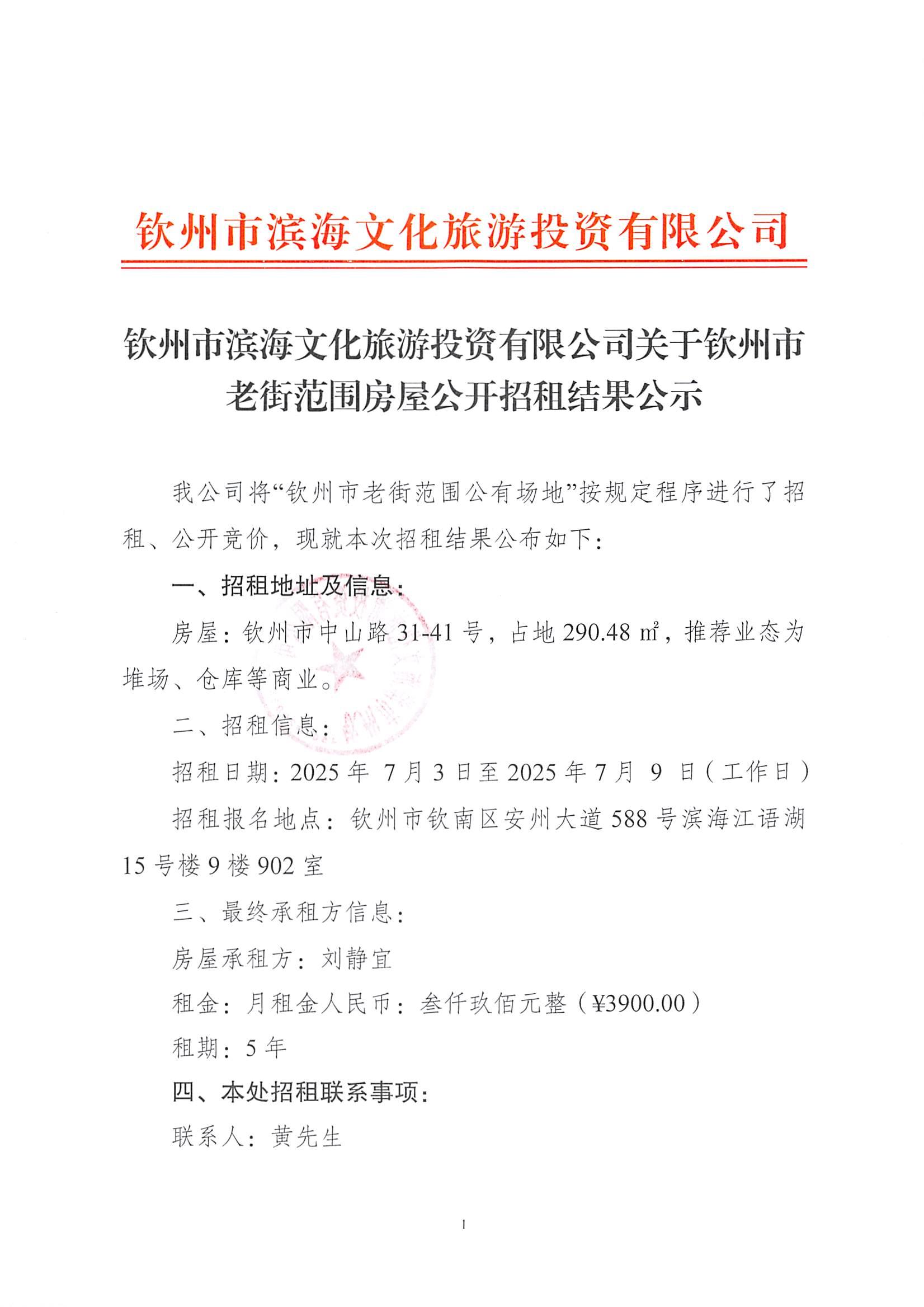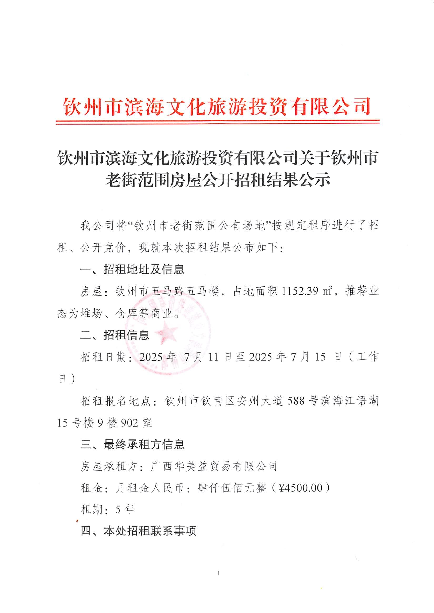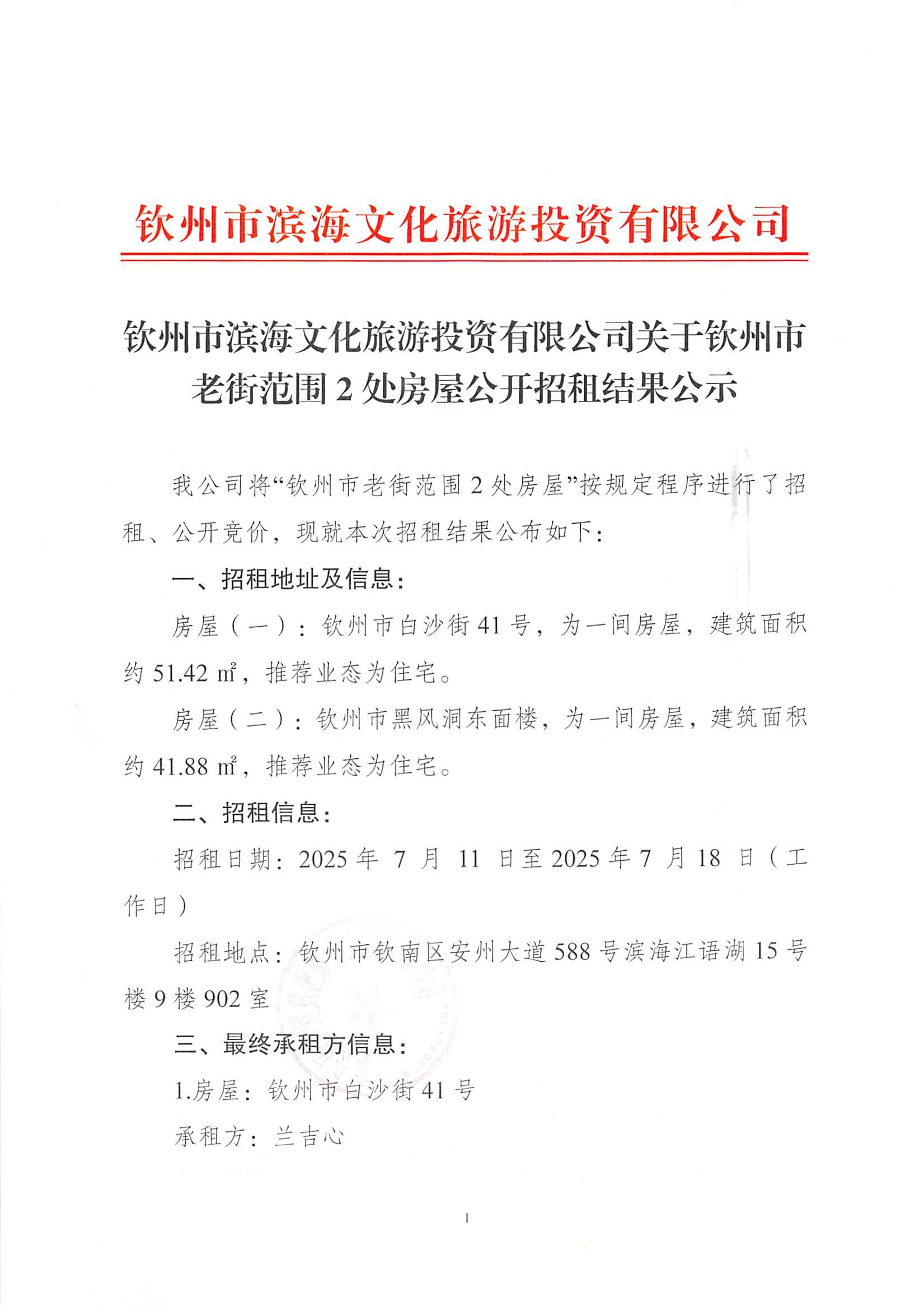 欽州市濱海文化旅游投資有限公司關(guān)于欽州市老街范圍2處房屋公開招租結(jié)果公...