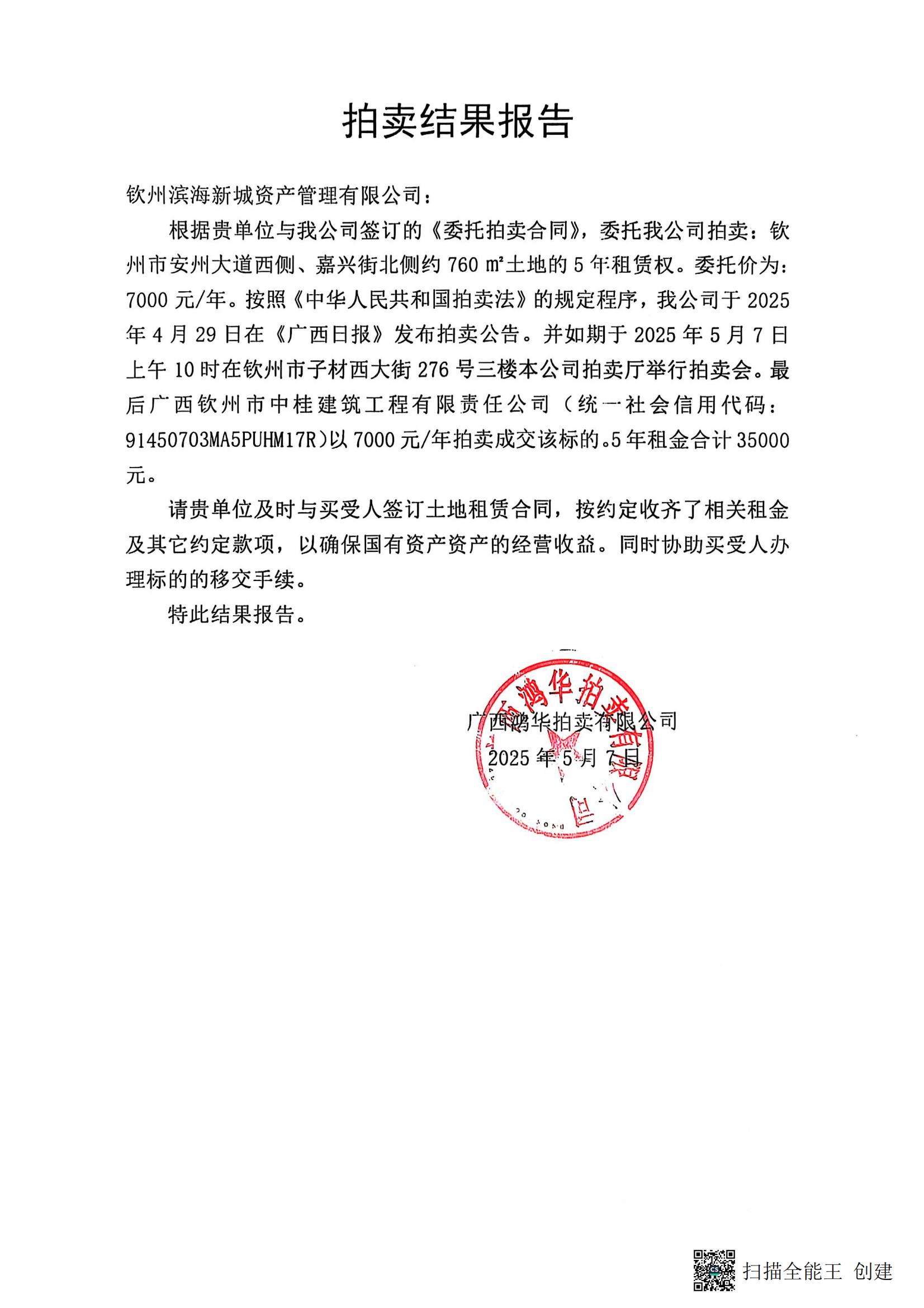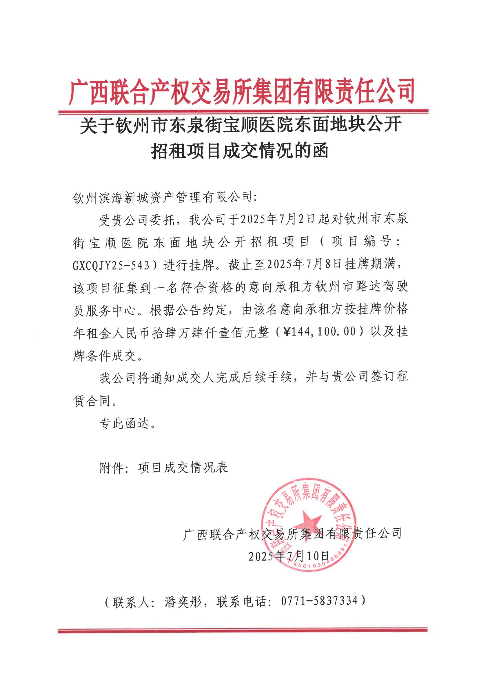關(guān)于欽州市東泉街寶順醫(yī)院東面地塊公開招租項目成交情況的函
