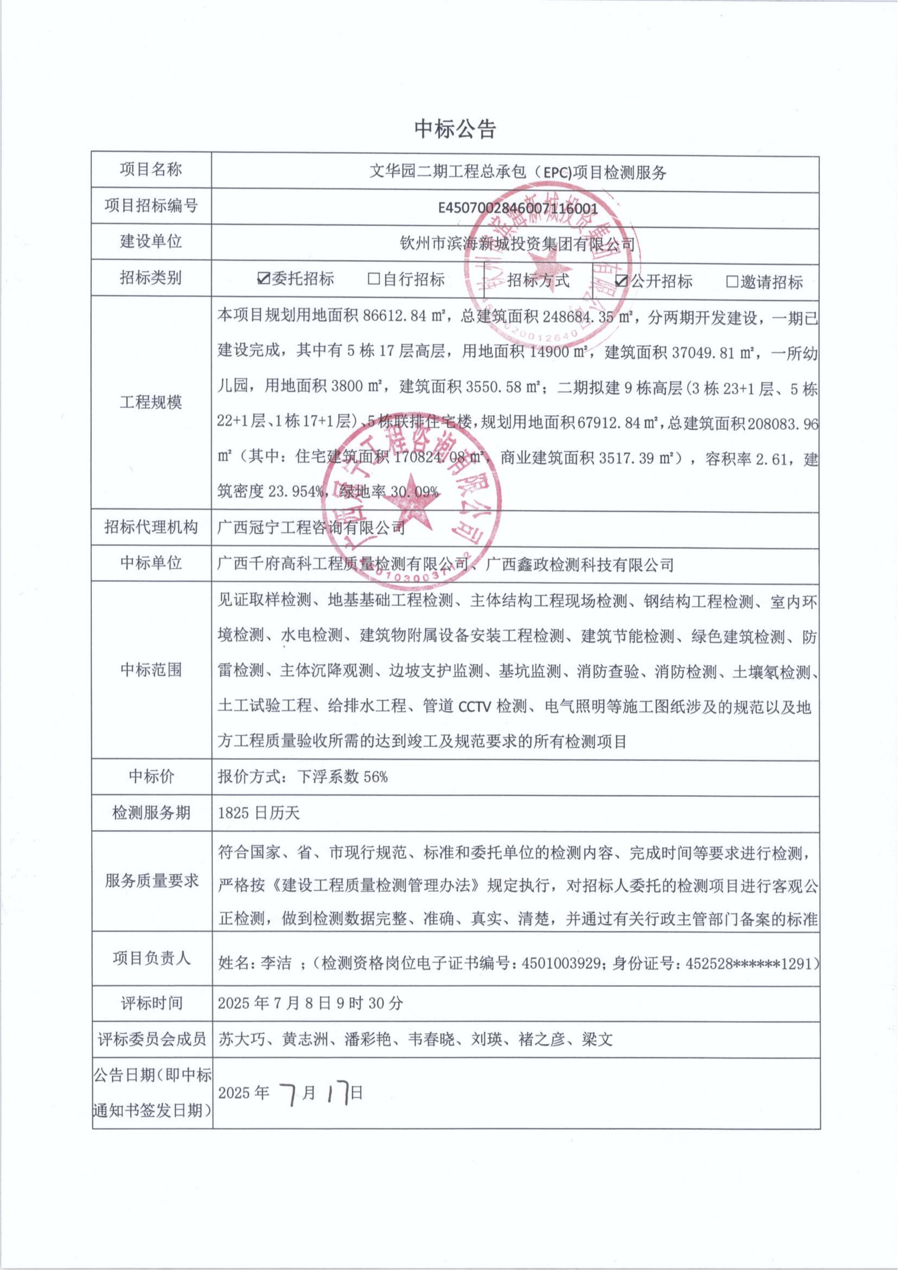 文華園二期工程總承包(EPC)項目檢測服務(wù)工程檢測招標中標候選人公示