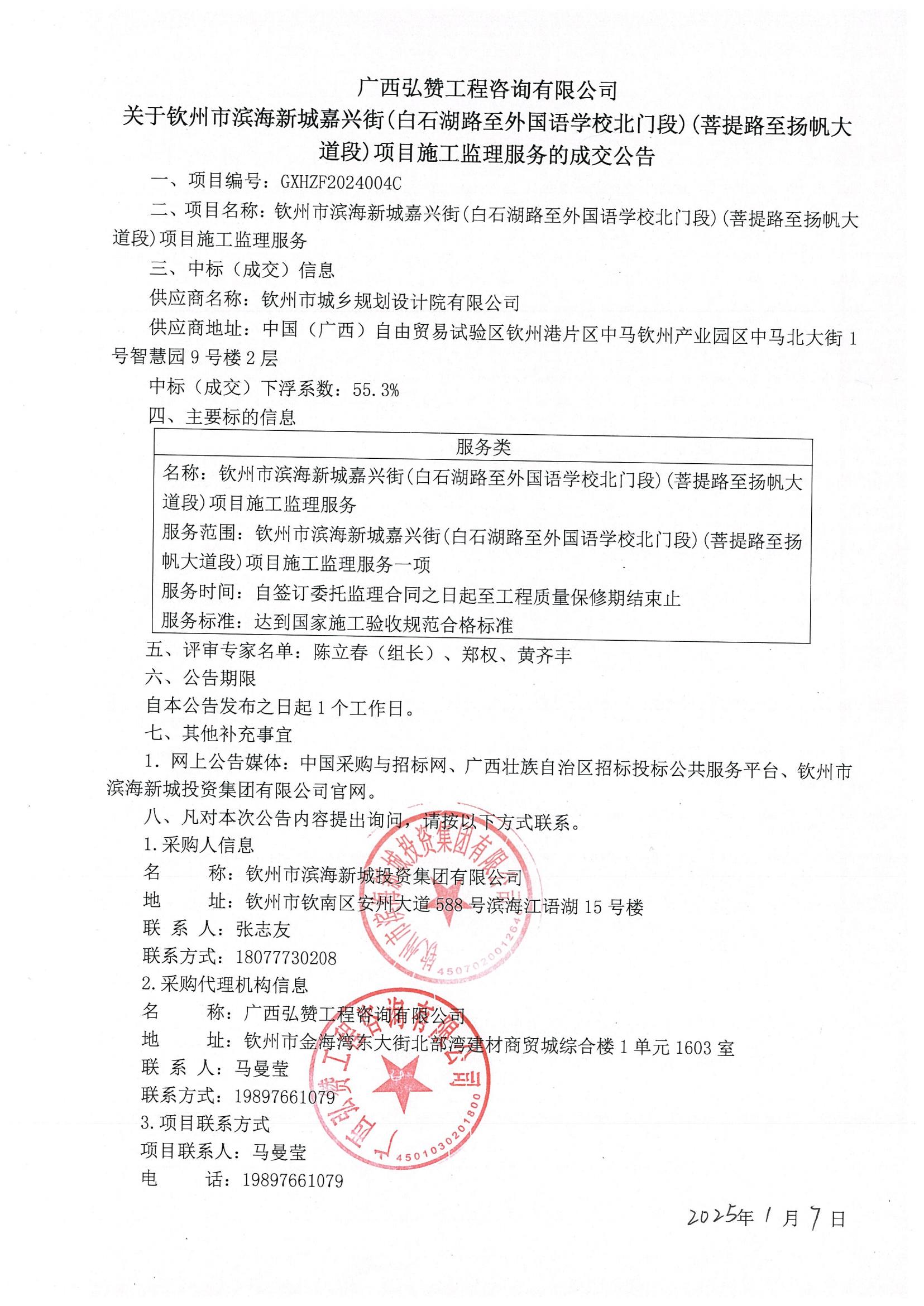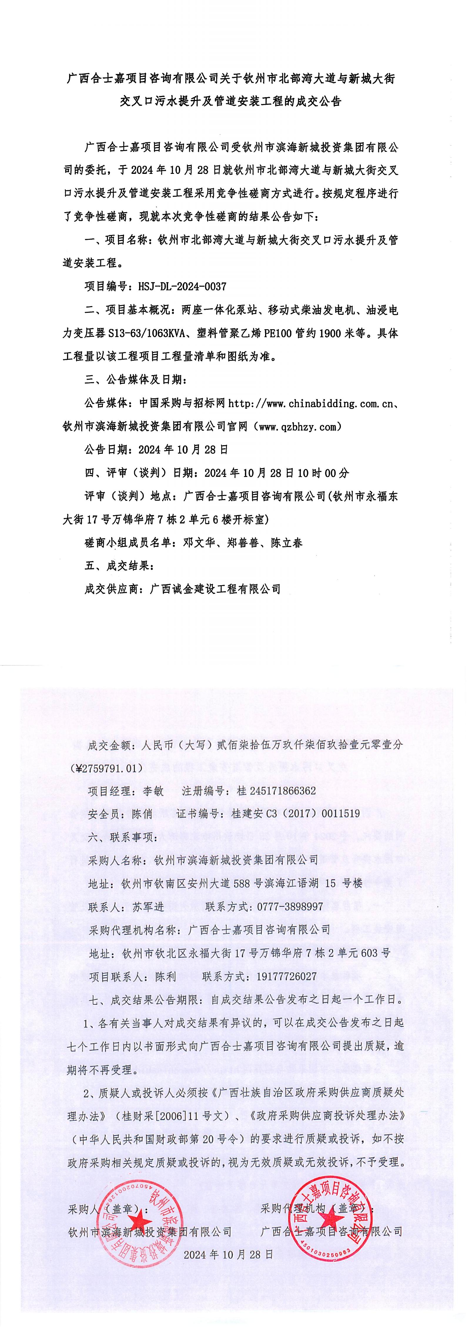 成交公告-欽州市濱海新城嘉興街污水泵站、K1+760處路燈箱變及10K...