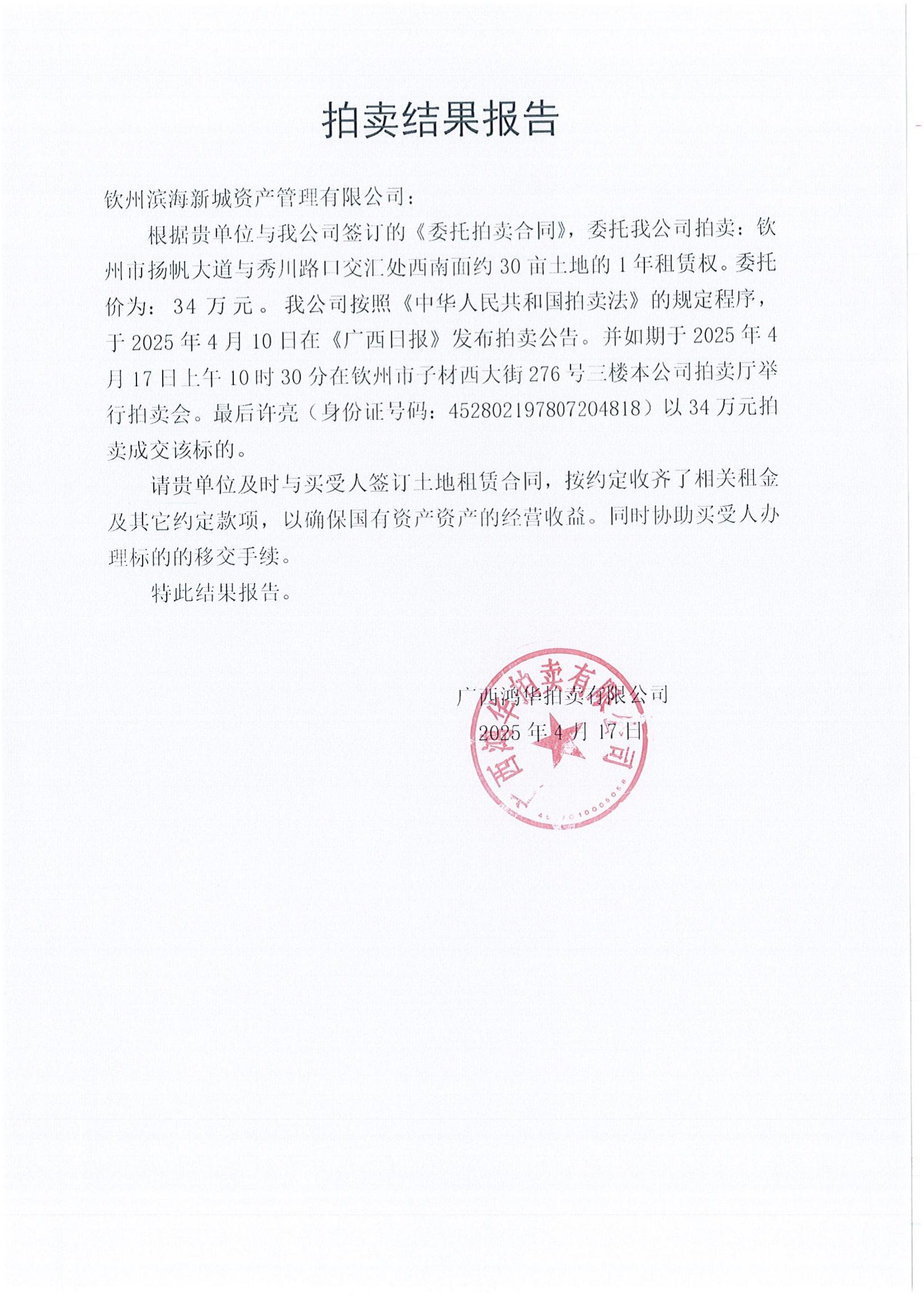 成交公告(欽州市七里香溪北面3畝土地)