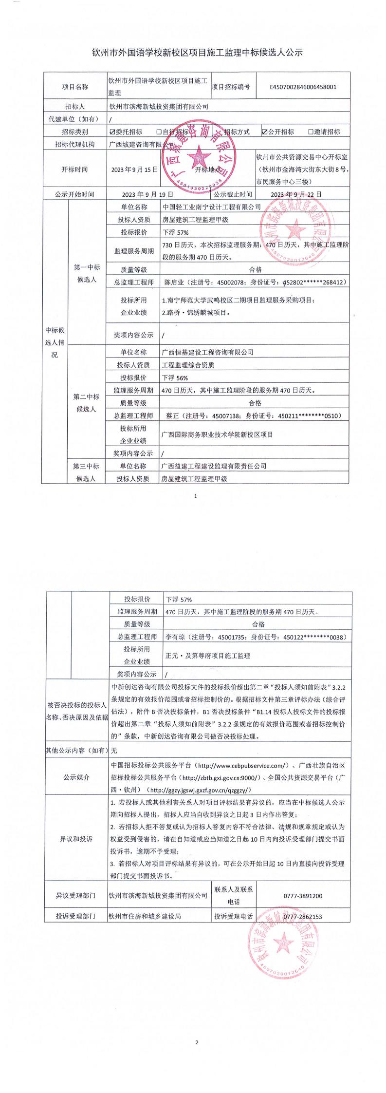 欽州市外國(guó)語(yǔ)學(xué)校新校區(qū)項(xiàng)目施工監(jiān)理中標(biāo)候選人公示