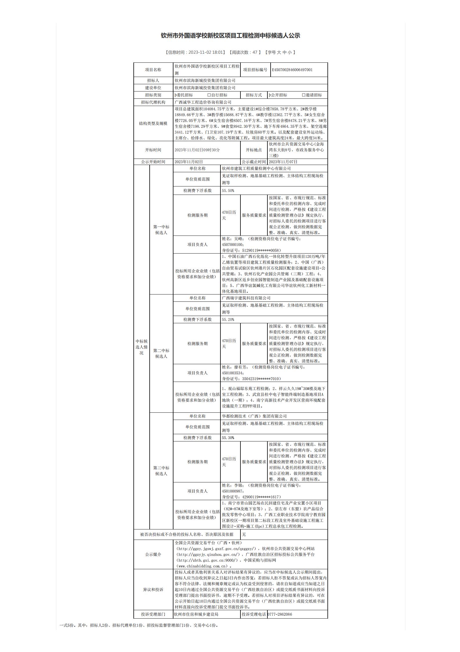 欽州市外國(guó)語(yǔ)學(xué)校新校區(qū)項(xiàng)目工程檢測(cè)中標(biāo)候選人公示