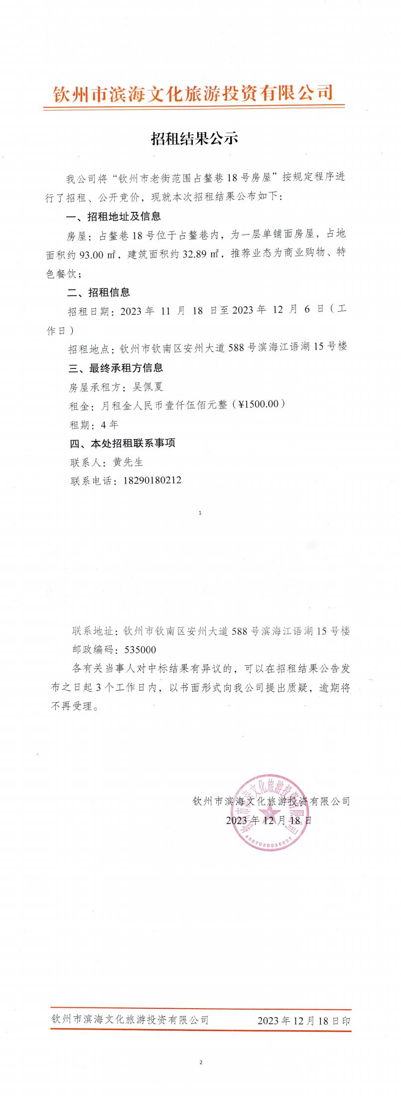 招租結(jié)果公示(占鰲巷18號(hào))