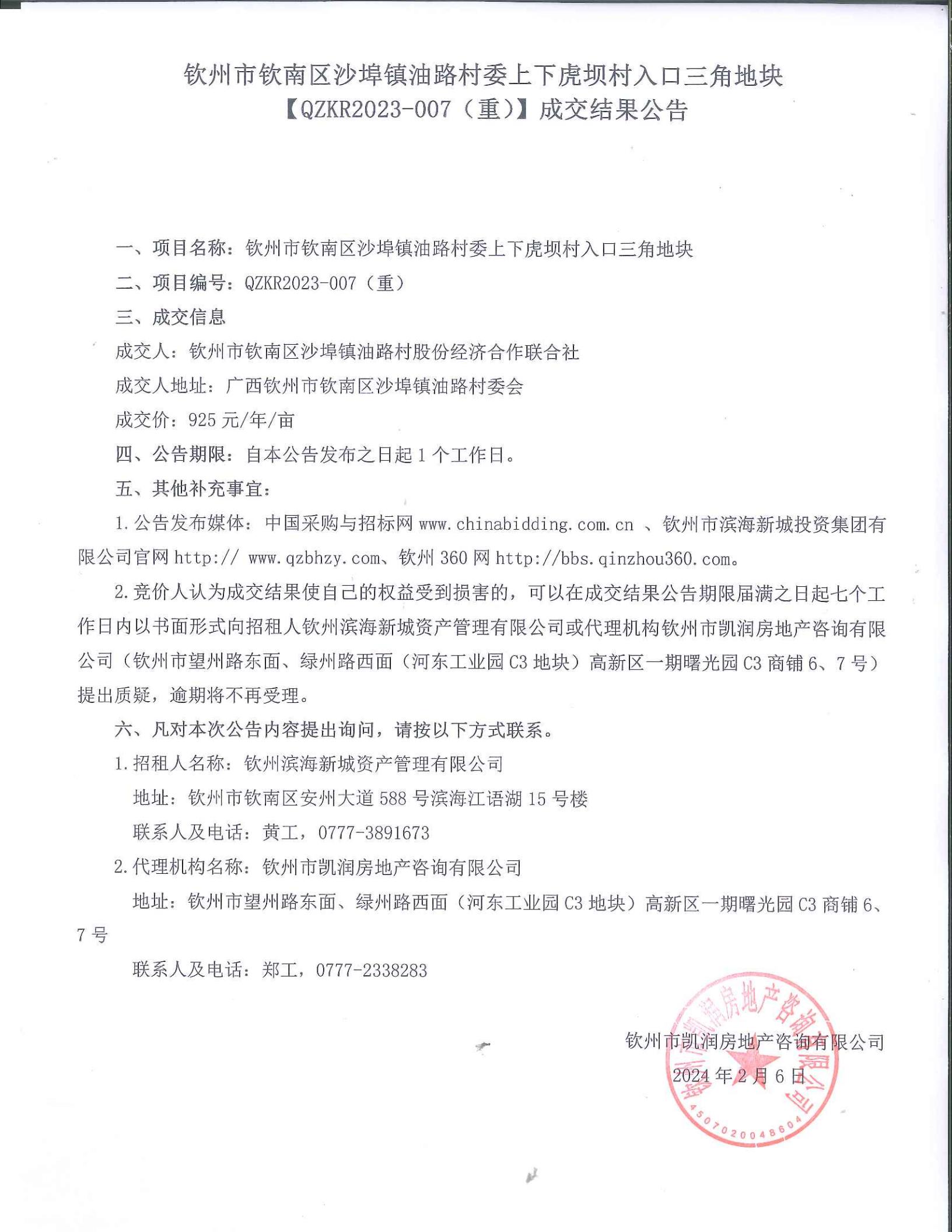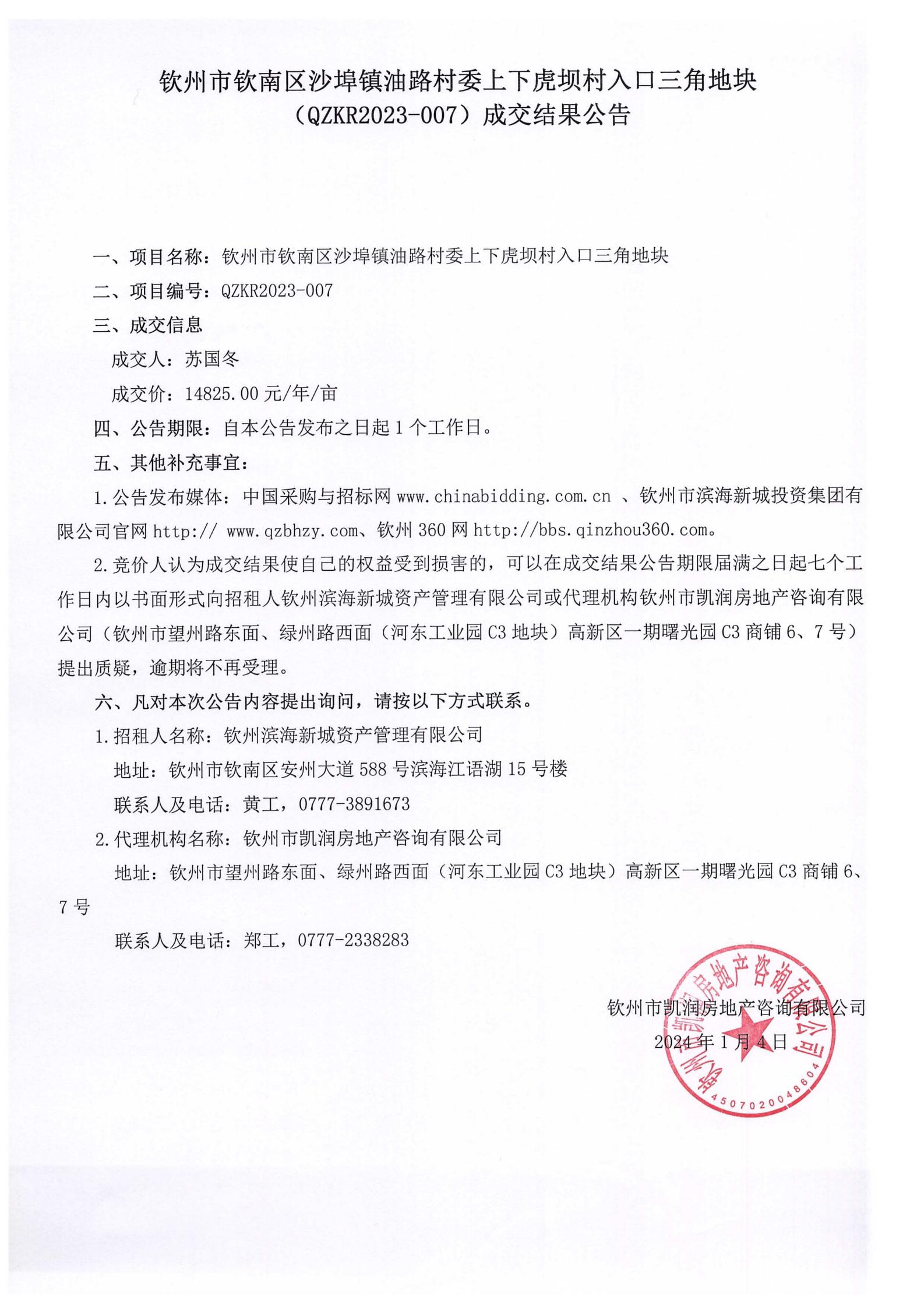 欽州市欽南區(qū)沙埠鎮(zhèn)油路村委上下虎壩村入口三角地塊〔QZKR2023-007(重)〕成交結(jié)果公告