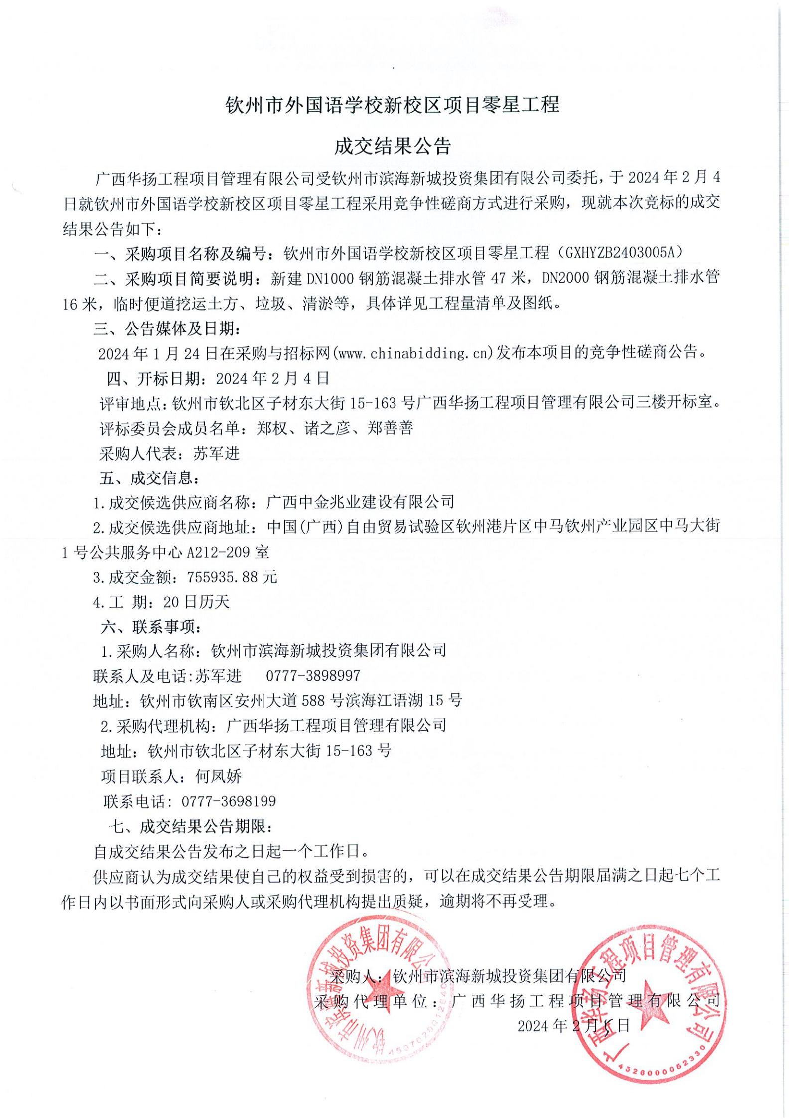 欽州市外國(guó)語(yǔ)學(xué)校新校區(qū)零星工程成交結(jié)果公告