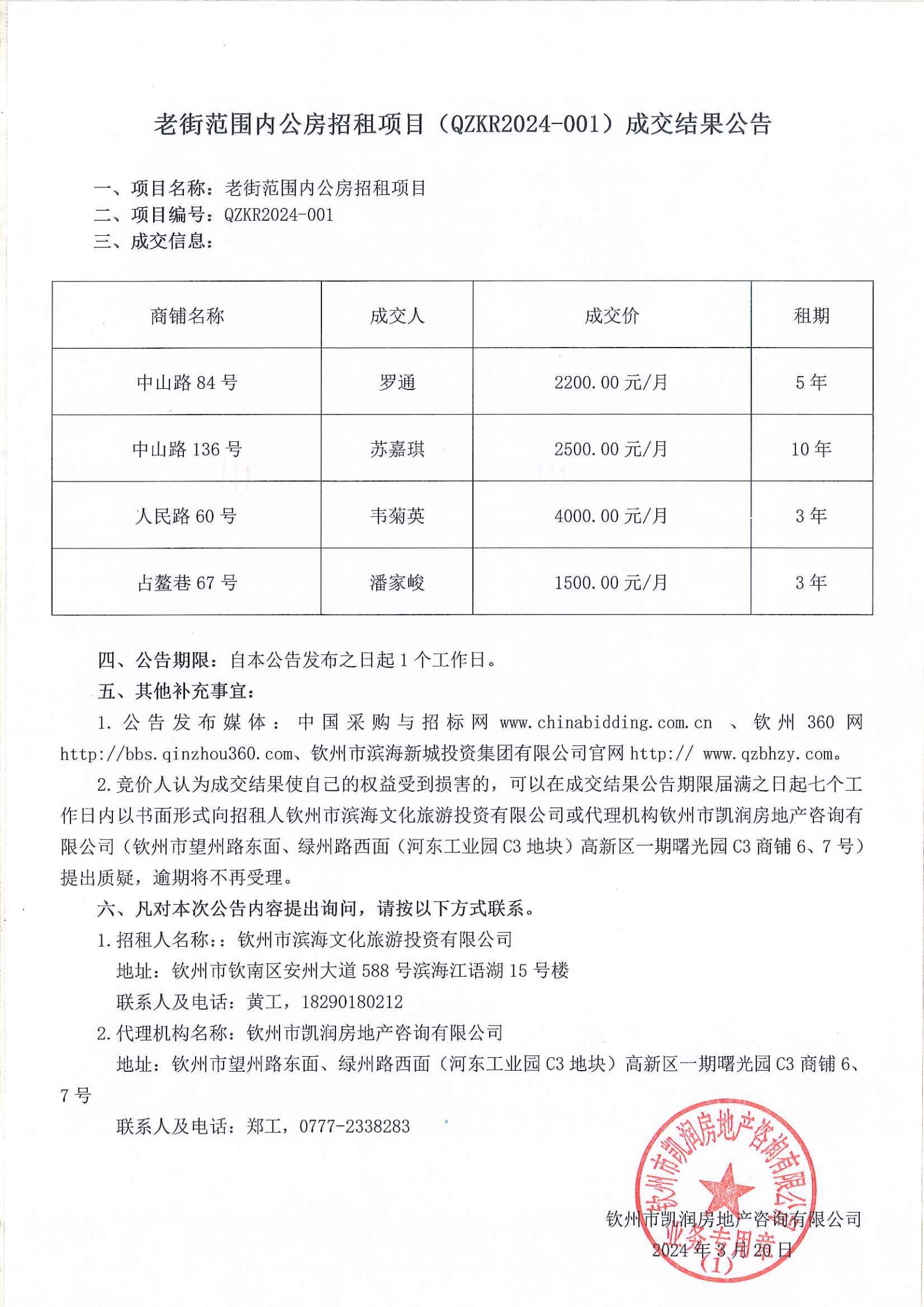 老街范圍內(nèi)公房招租項(xiàng)目(QZKR2024-001)成交結(jié)果公告