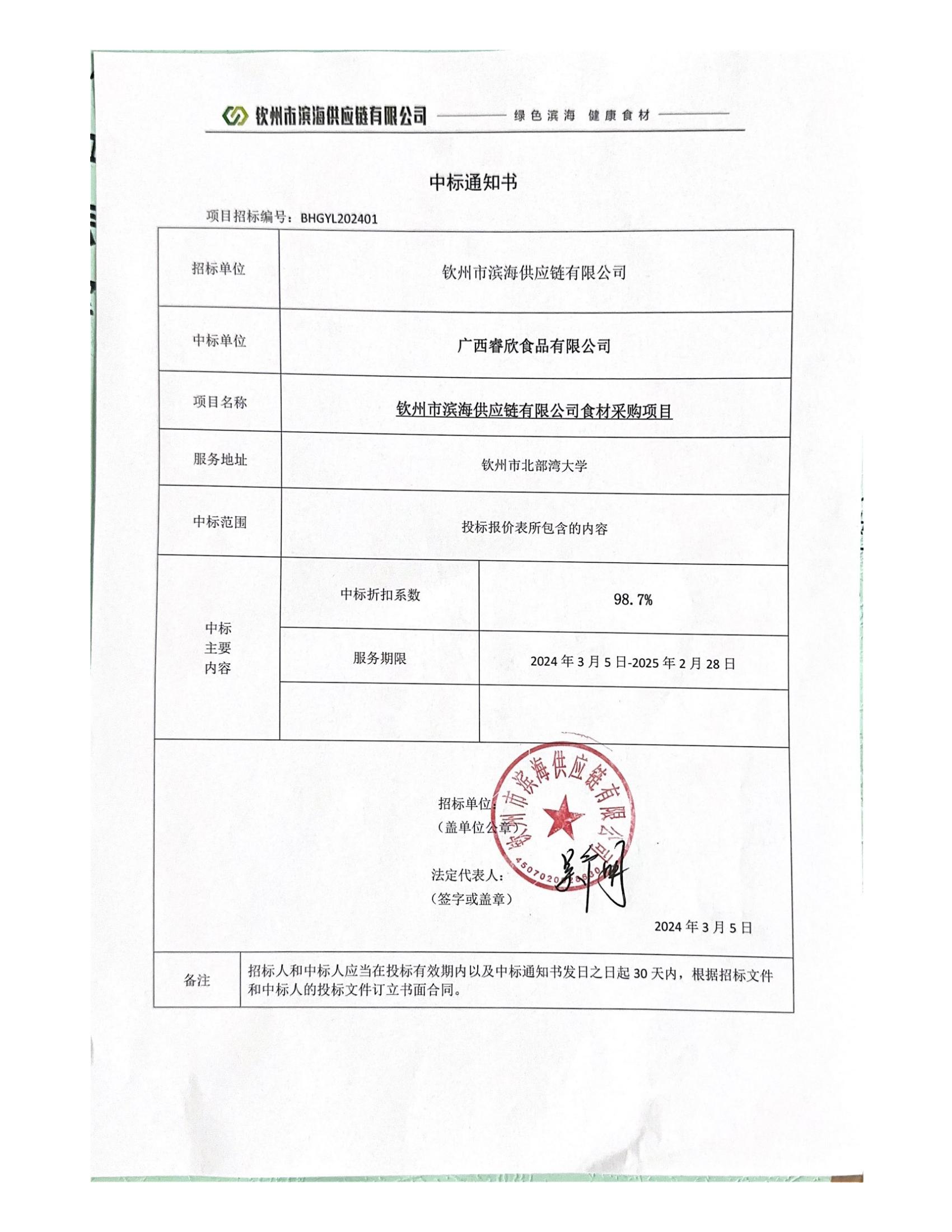 中標(biāo)通知書(shū)(欽州市濱海供應(yīng)鏈有限公司食材采購(gòu)項(xiàng)目)