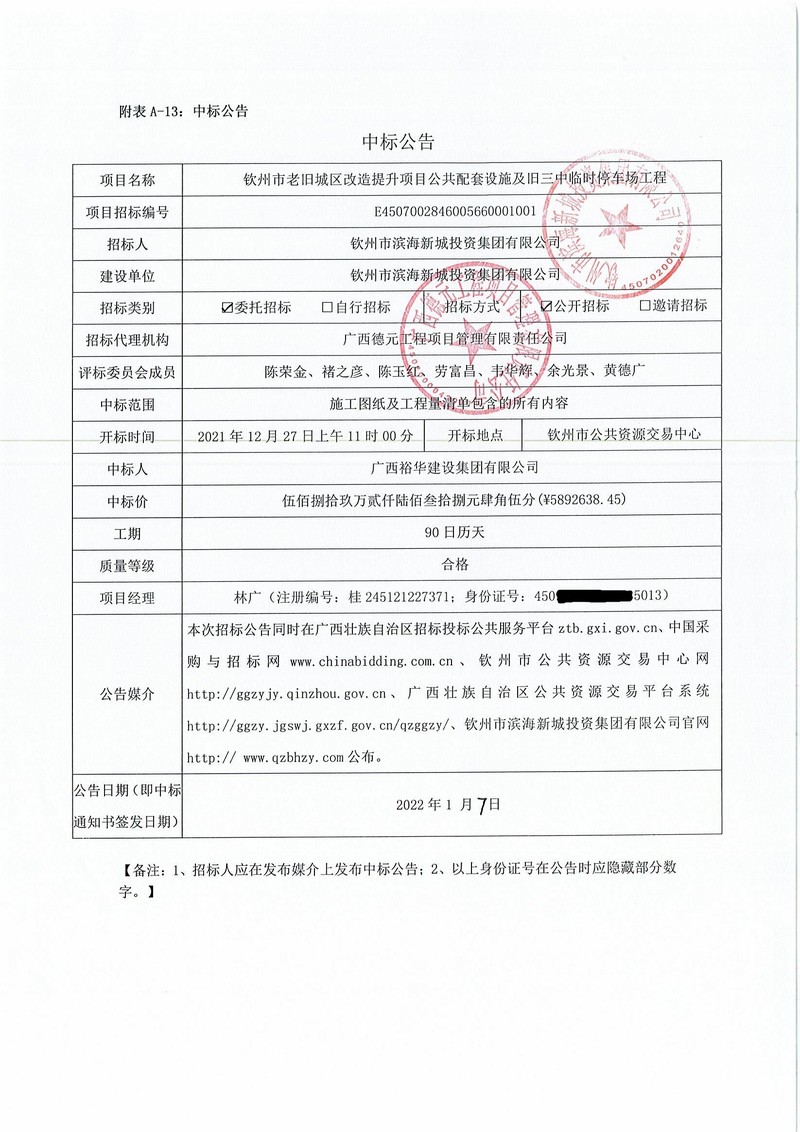 中標(biāo)公告-欽州市老舊城區(qū)改造提升項(xiàng)目部分房屋修繕及景觀工程設(shè)計(jì)-施工總承包(EPC)