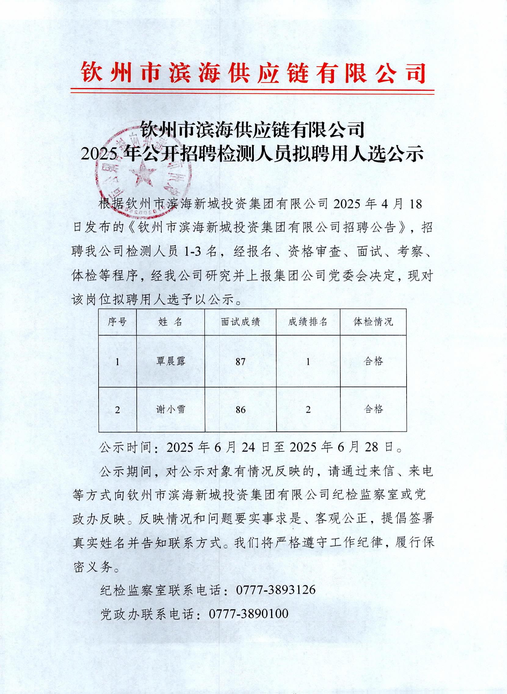 欽州市濱海供應(yīng)鏈有限公司2025 年公開招聘檢測人員擬聘用人選公示