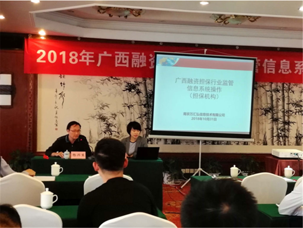 2018年10月31日,由自治區(qū)金融辦組織,在桂林榕湖飯店由系統(tǒng)設(shè)計方南京萬匯弘信息科技有限公司負責(zé)人陳月對廣西融資擔(dān)保行業(yè)監(jiān)管信息系統(tǒng)操作進行培訓(xùn)。