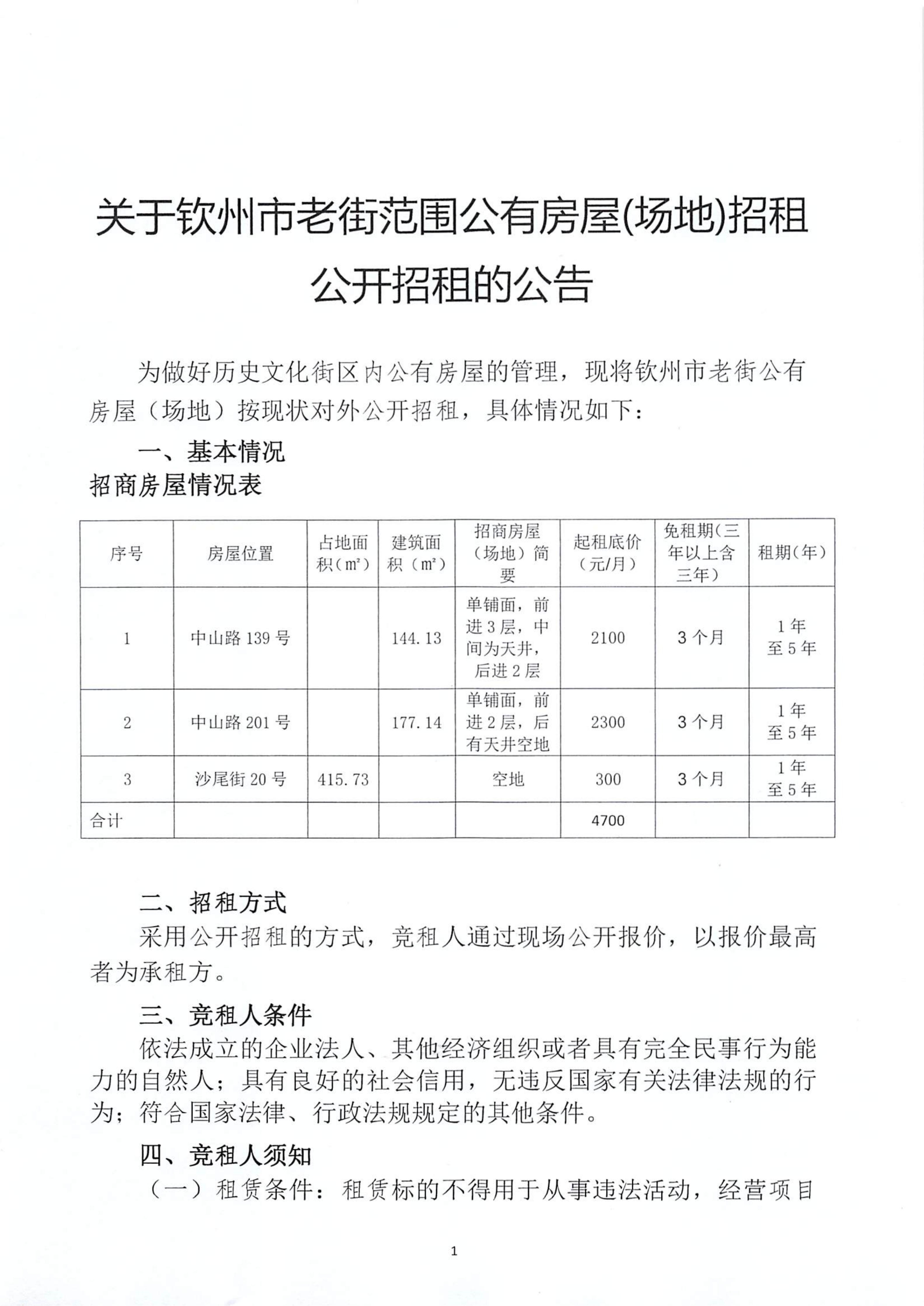 關(guān)于欽州市老街范圍公有房屋(場(chǎng)地)招租公開招租的公告(中山路139號(hào)、中山路201號(hào)、沙尾街20號(hào))